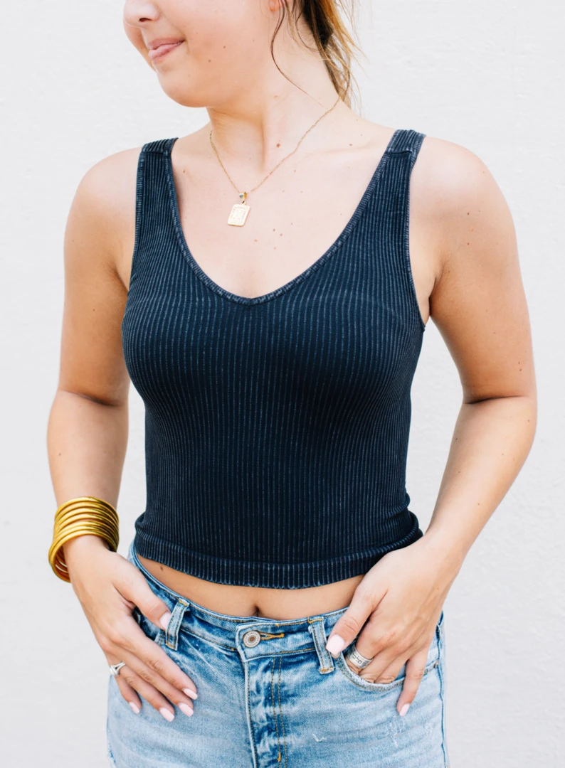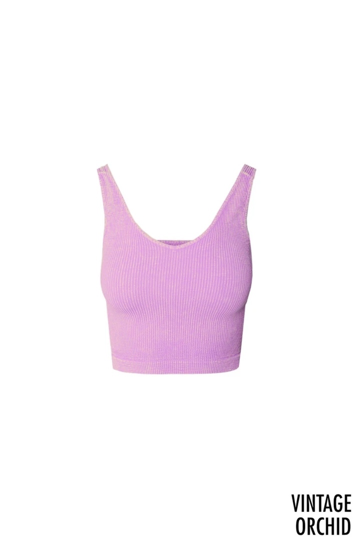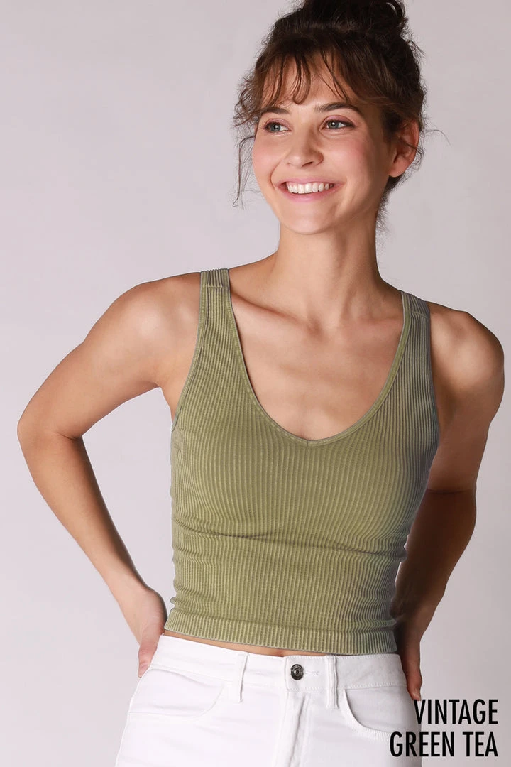 This vintage wash one size tank top is a trendy basic that everyone needs in their closet! It is a ribbed, seamless knit that features a v neckline and a cropped silhouette. This top has a stretchy, universal fit that everybody can wear!Â