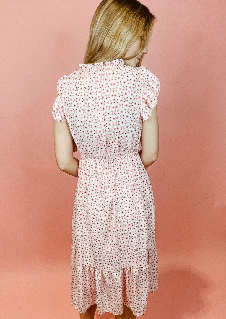 The Ottie Printed Midi Dress features an all over abstract pattern, short flutter ruffle sleeves, an elastic waistband, and a flowy silhouette with a ruffle at the bottom hem. The Ottie dress is perfect for any spring and summer occasion – you can easily dress it up or dress it down!Â