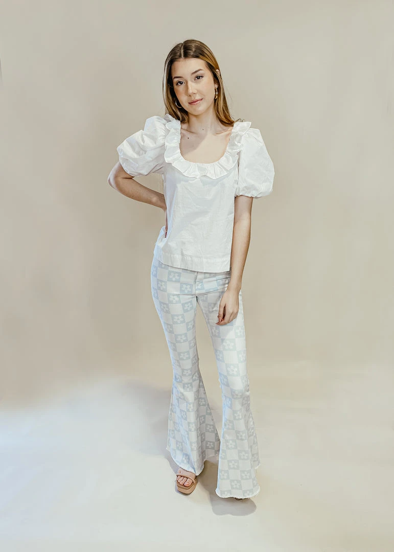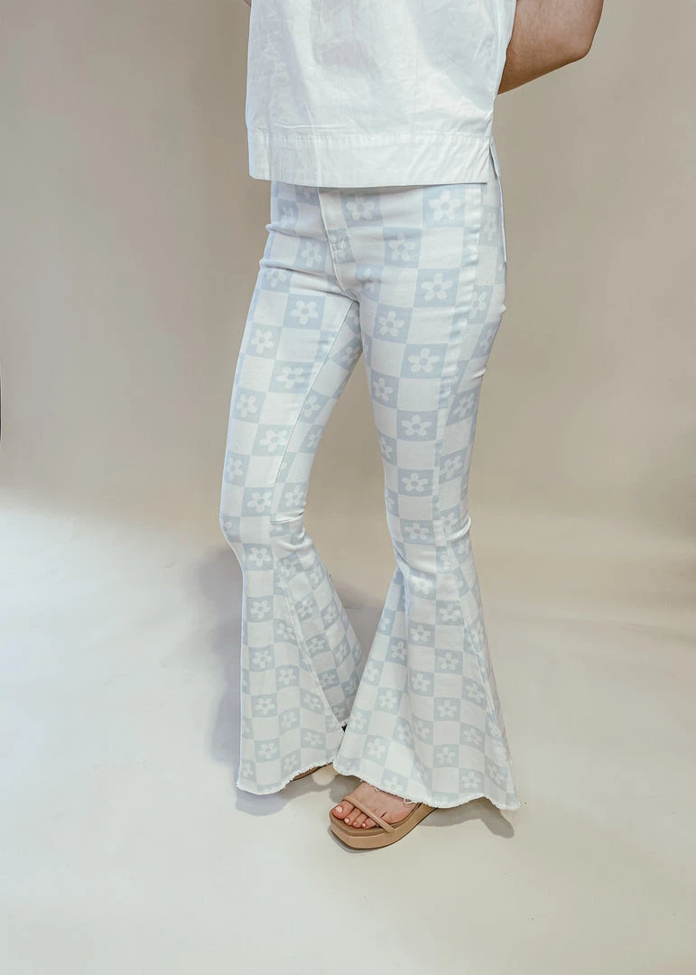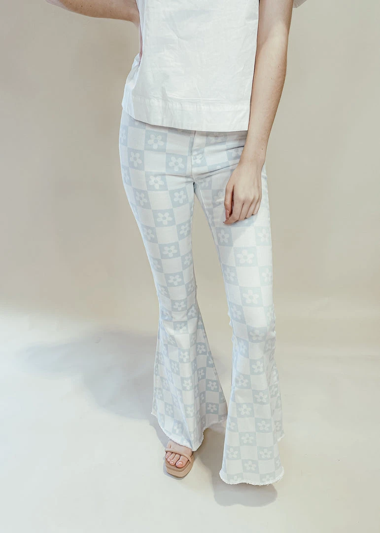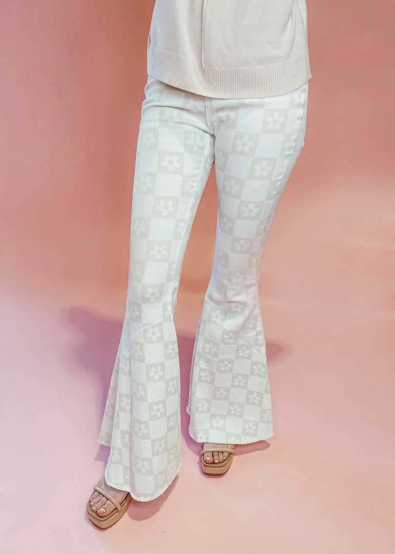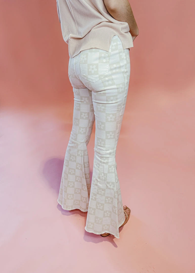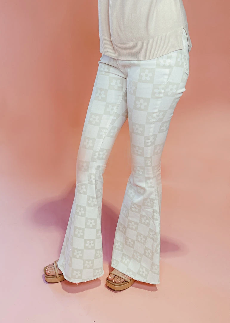 The Daisy Checker Print Flares are giving us all of the retro vibes – we’re obsessed! These flare jeans feature a high rise waist with a button and zipper closure, a checkered daisy pattern, and a super flared leg with a raw hem.Â