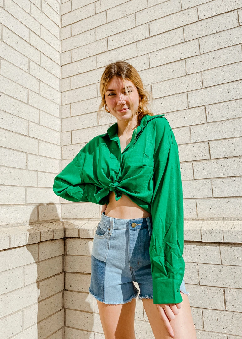 The Indiana shorts feature a flattering high rise waist with a button and zipper closure, front and back pockets, and a frayed hem. We’re obsessed with the trendy, super cute patchwork style. Pair the Indiana shorts with any top in your closet to easily create a fun, retro inspired look!