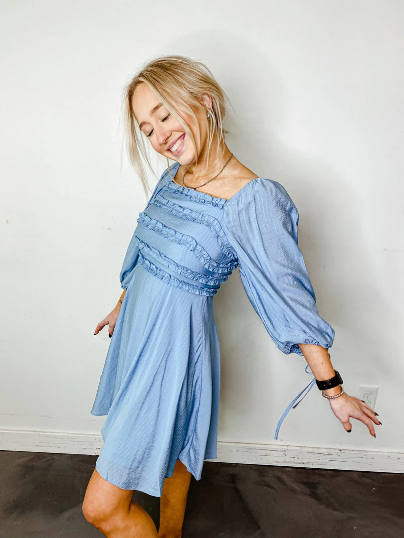 The Faye dress features an always flattering square neckline, balloon sleeves with self tie accents at the cuff, ruffle details on the bust, a flowy fit, and a hidden zipper closure on the back.Â