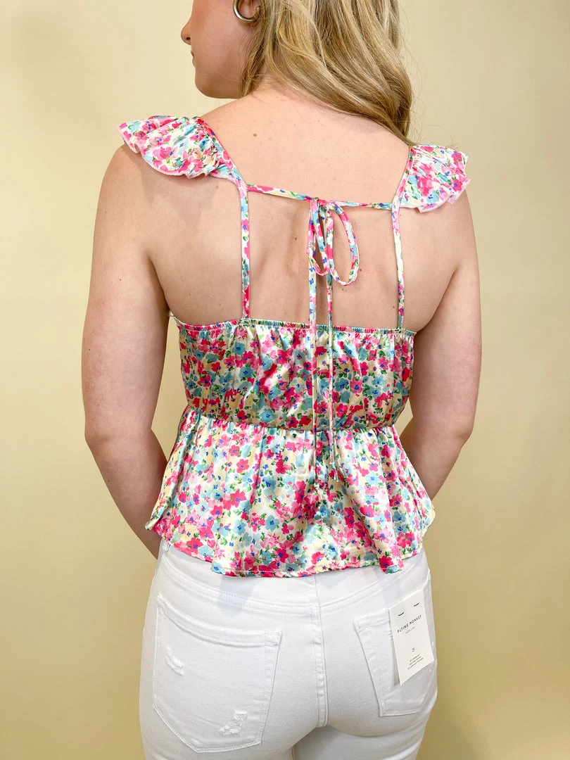 The Ophelia Floral Peplum Top features an all over colorful, dainty floral pattern, flutter ruffle straps on the shoulder, an open back with an adjustable self tie, and a flattering peplum hem. Pair the Ophelia top with fun, trendy accessories and your favorite denim shorts!