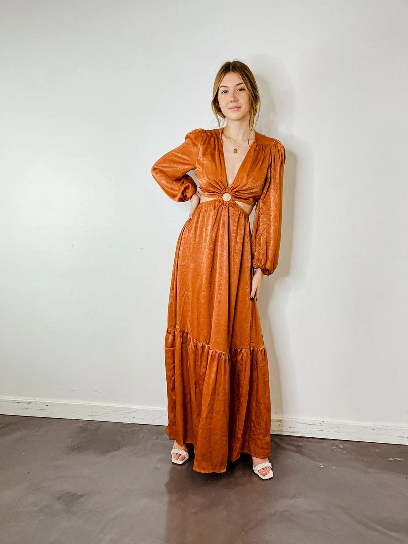 - Elevate your wardrobe with the Peach Love Orion Satin Maxi Dress, a luxurious and elegant evening gown designed for women who appreciate timeless style and comfort.