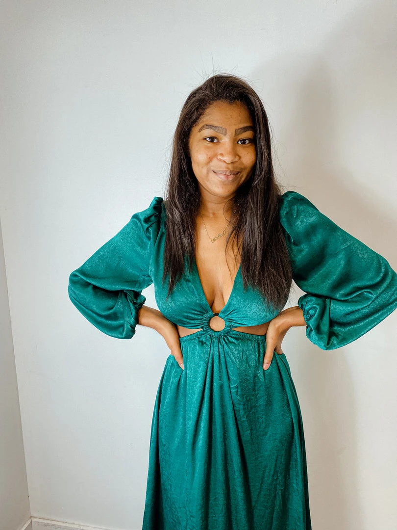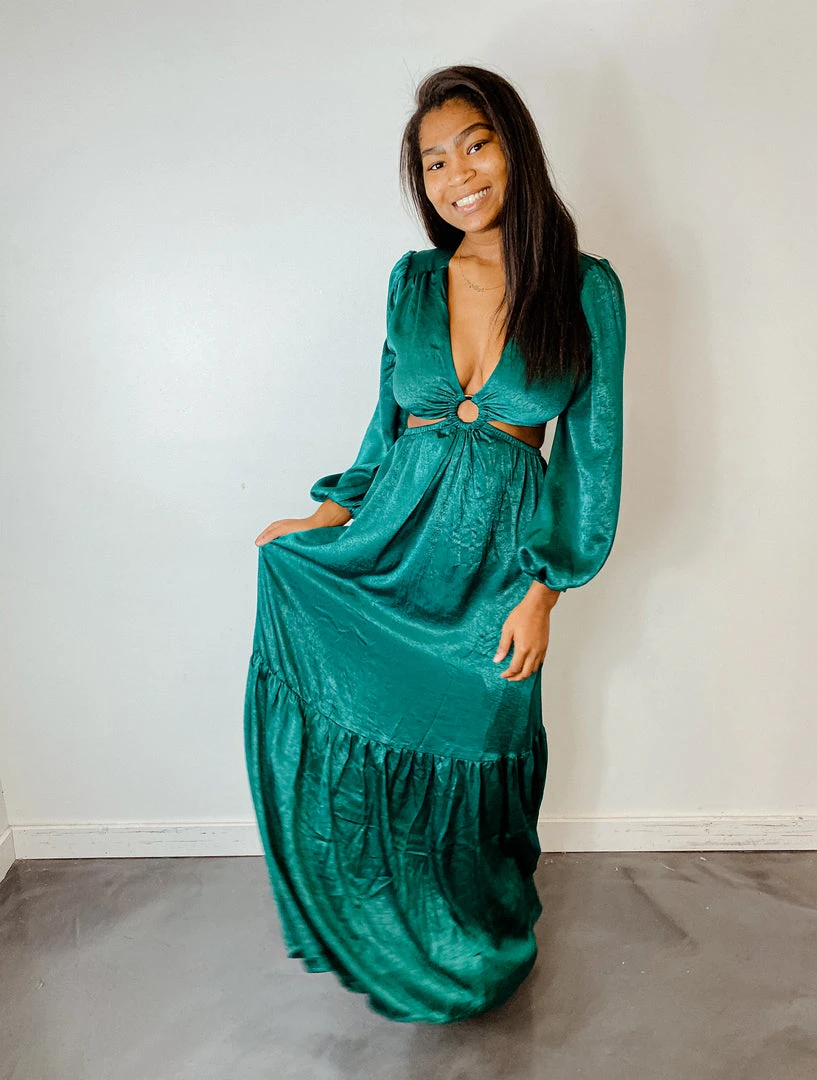 - The Peach Love Orion Satin Maxi Dress features a flattering V-neckline, adjustable straps, and a cinched waist to accentuate your figure, ensuring a perfect fit for every body type.
