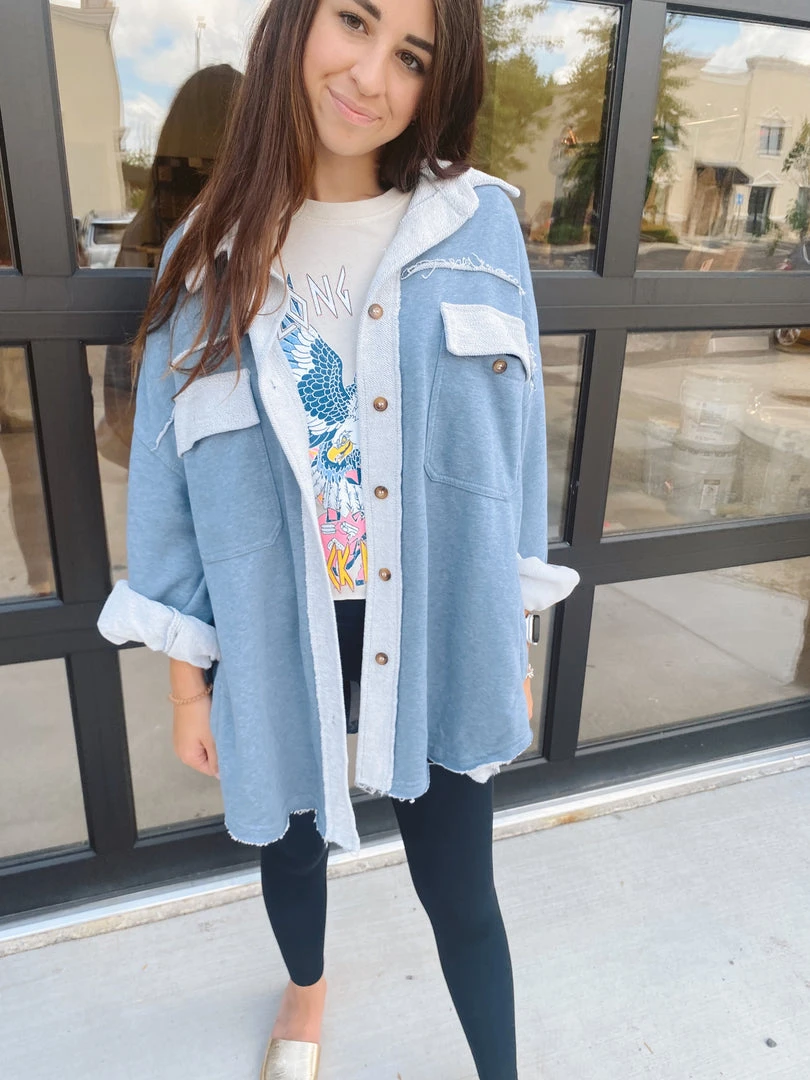 We are so obsessed with shackets (shirt-jackets) this season! This cold weather closet essential features a comfy oversized fit, a button up closure on the front, pockets, and an exposed seam detail. We will be throwing it on over leggings and a graphic tee!