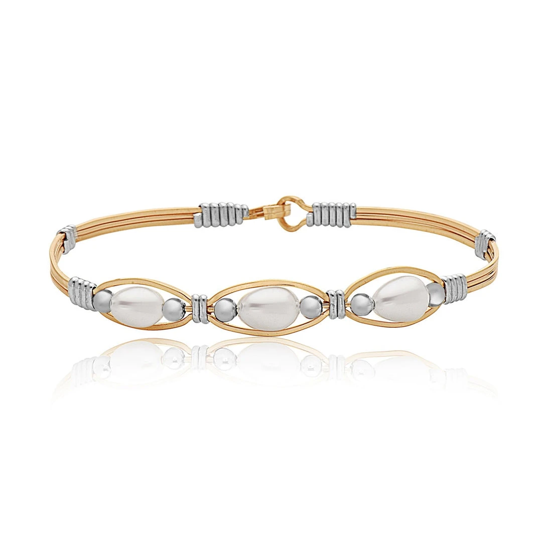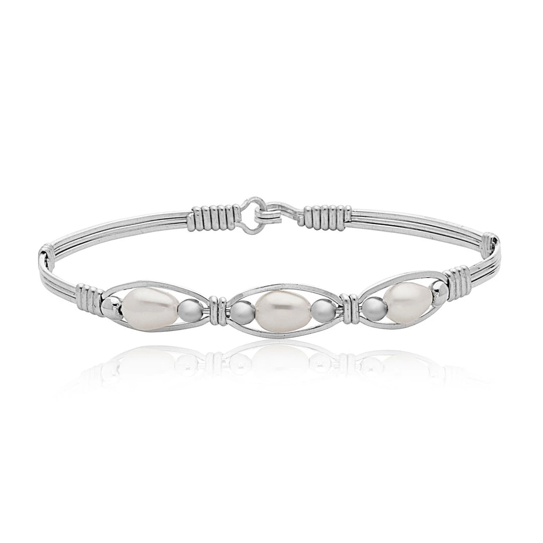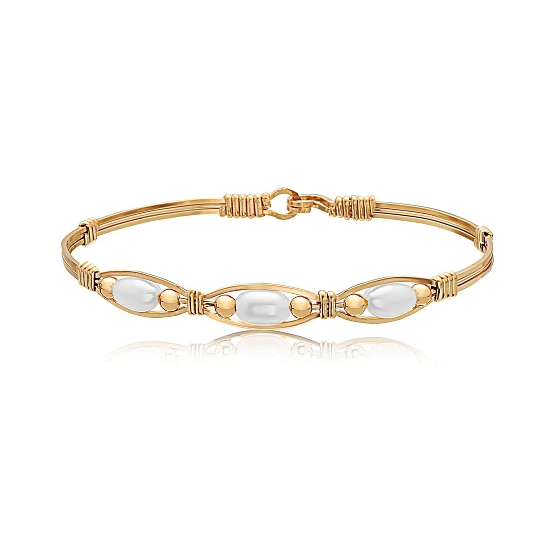 The Bella Bracelet is created from beautiful sterling silver or 14k gold artist wire. It has three freshwater pearls.