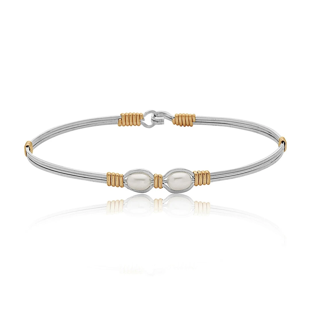 The Faith bracelet is crafted from sterling silver and 14k gold artist wire. It has two freshwater pearls.
