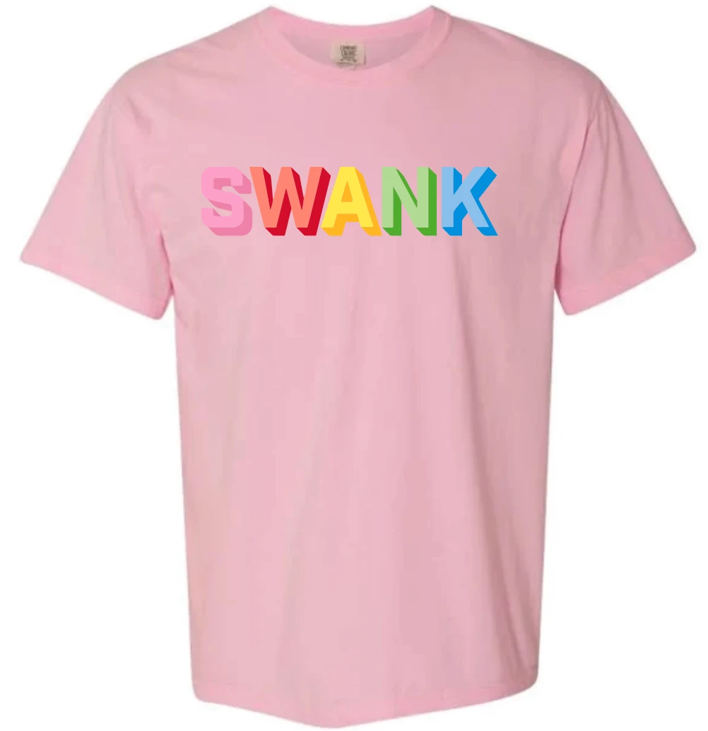 - The Rainbow Swank Tee is part of the exclusive Swank Merch collection, making it a must-have for fans of unique and stylish apparel. Pair it with jeans or shorts for a laid-back, trendy outfit.