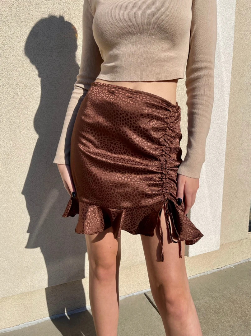 - Crafted with premium satin fabric, the Frankie Skirt offers a smooth and comfortable fit. The ruched detailing adds texture and movement, ensuring you stand out with every step.