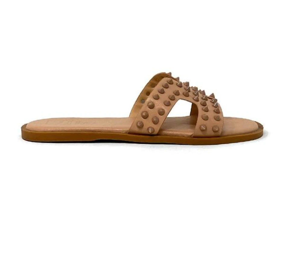 Slide into the warm weather in the Carolina Studded Sandals! These studded sandals feature sassy studs to give them the perfect edge! They are easy to slip on for a quick run to the store, baseball game, or to dress up for a nice dinner. They fit true to size and feature wider straps to prevent them from slipping.