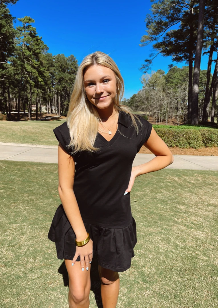 The Simone Tennis Dress is a lightweight cotton terry fabric and it features a v neckline with a collar, short sleeves, and a ruffle bottom hem. Pair the Simone Tennis Dress with your favorite sneakers to easily complete a trendy, sporty look!