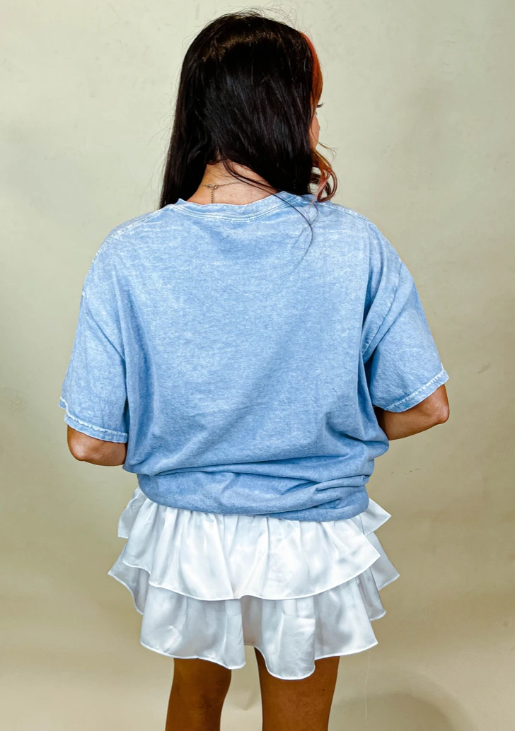 The Sun Kissed Mineral Wash Tee is a summertime must have! This fun graphic tee shirt features a sun kissed graphic printed on the front, an oversized silhouette, and an all over vintage inspired mineral wash. Pair this graphic tee with denim shorts or throw it on over your bathing suit!