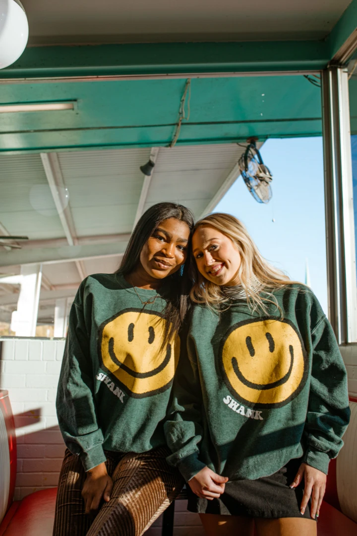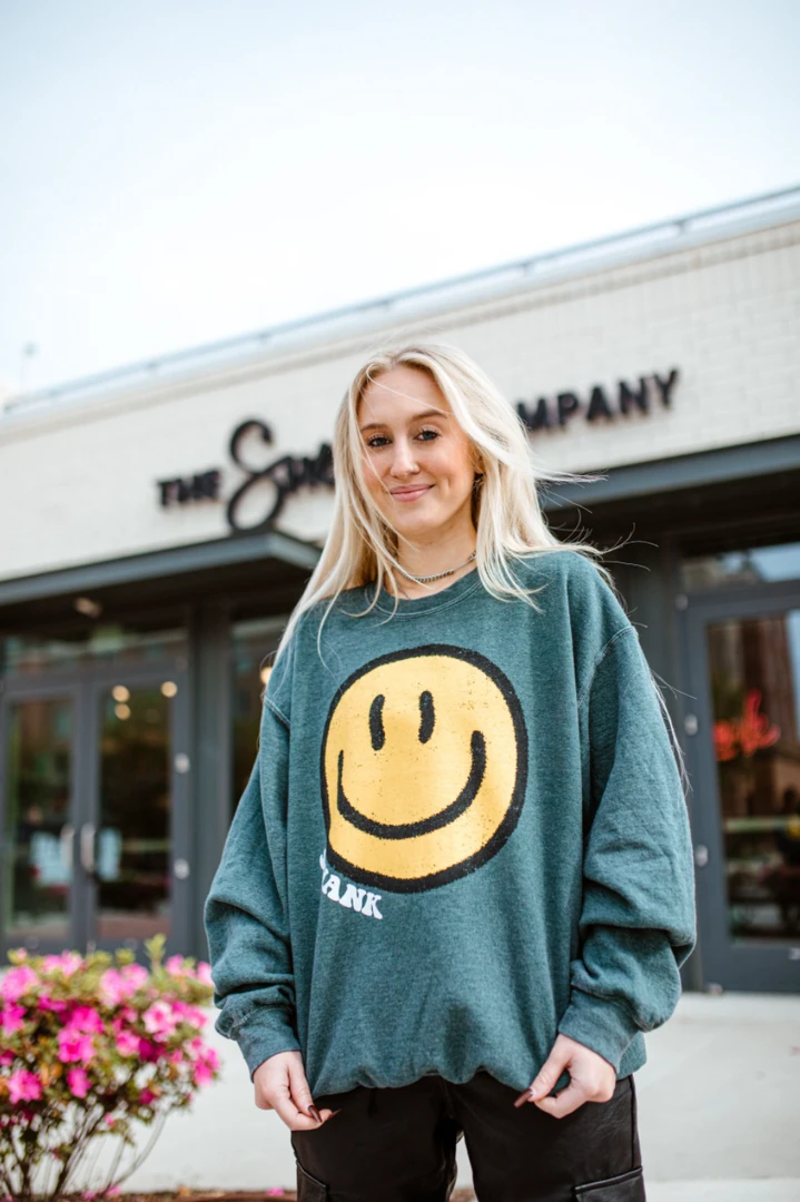 - Featuring a trendy smiley design, this sweatshirt is perfect for casual outings, lounging at home, or adding a fun touch to your everyday wardrobe.
