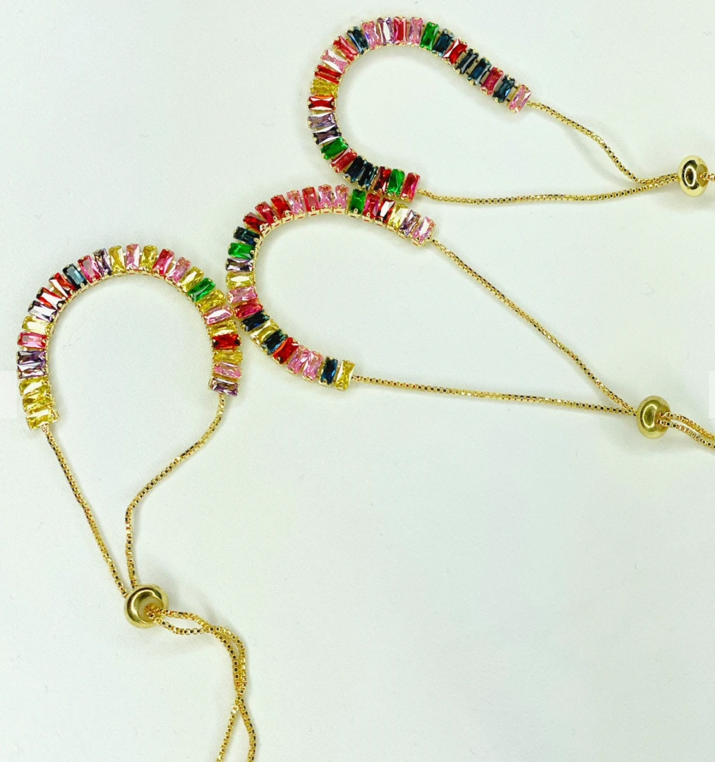 The Brynn Baguette Adjustable Bracelet is a beautifully crafted dainty piece that is a must have in your jewelry collection. Featuring a gold adjustable bracelet and colorful stone detail, it can be worn with anything in your closet.