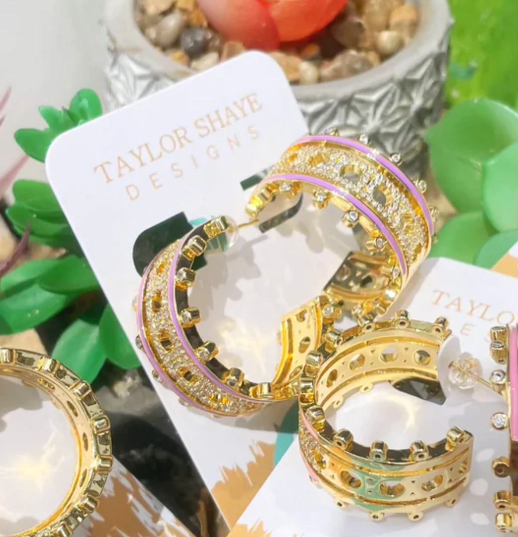 - Elevate your style with the Taylor Shaye Designs Stormi Hoop Earrings. These elegant gold-plated hoops are designed to add a touch of sophistication to any outfit.