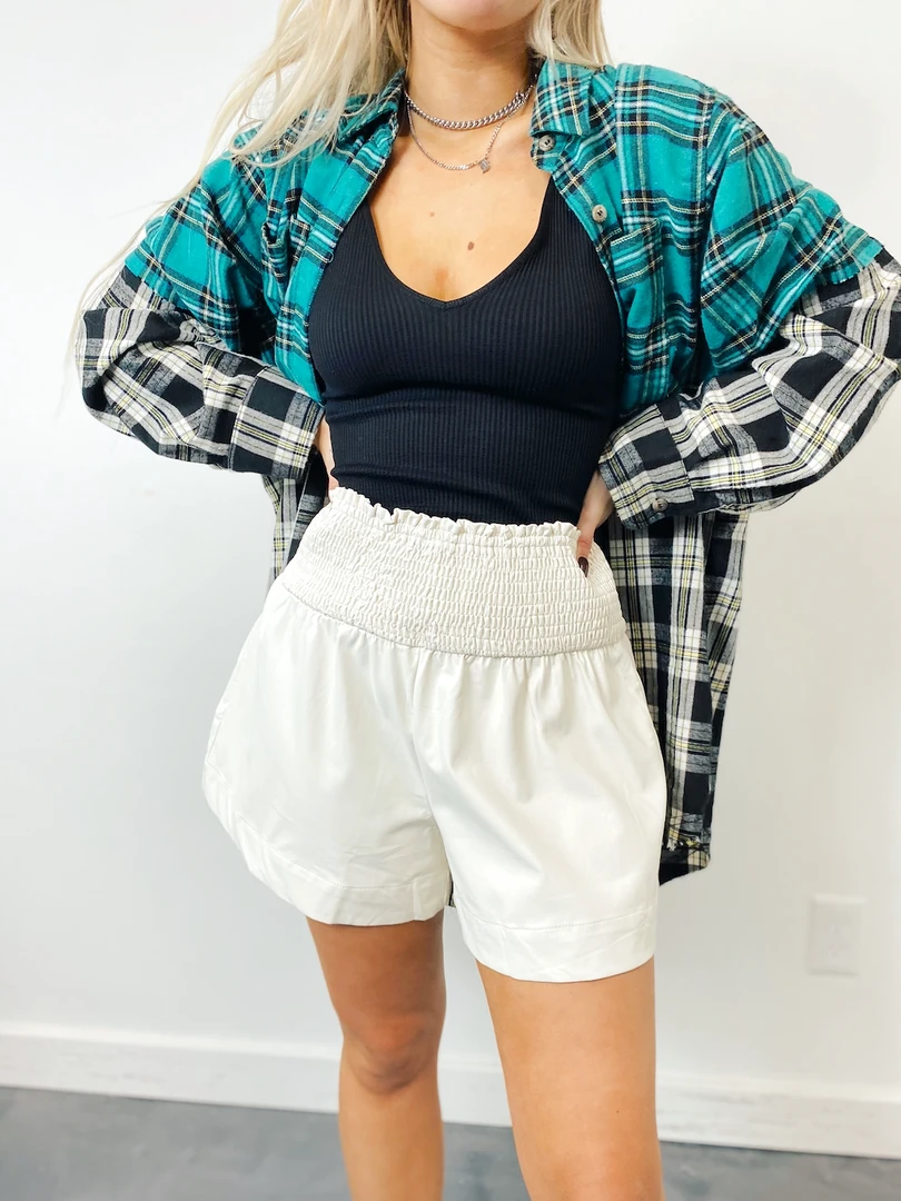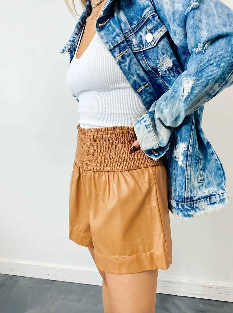 - Available in a versatile range of colors, the TCEC Cameron Leather Smocked Shorts are perfect for pairing with your favorite tops, blouses, or tees for a chic, effortless look.