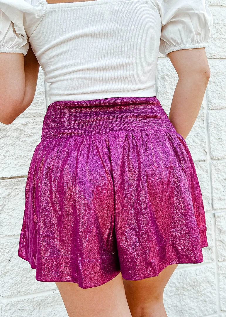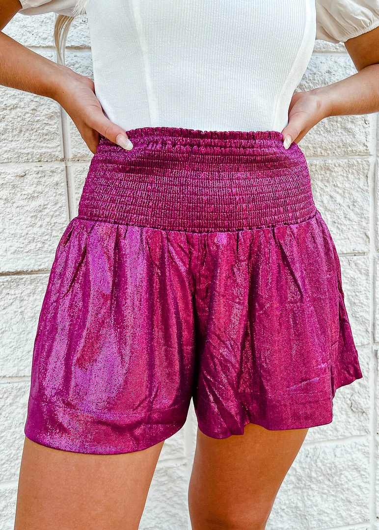 The Ella Metallic Smocked Shorts feature an elastic smocked waistband, an all over metallic sheen, and a flowy silhouette. Pair the Ella Smocked Shorts with any top in your closet to easily create the cutest on trend look!