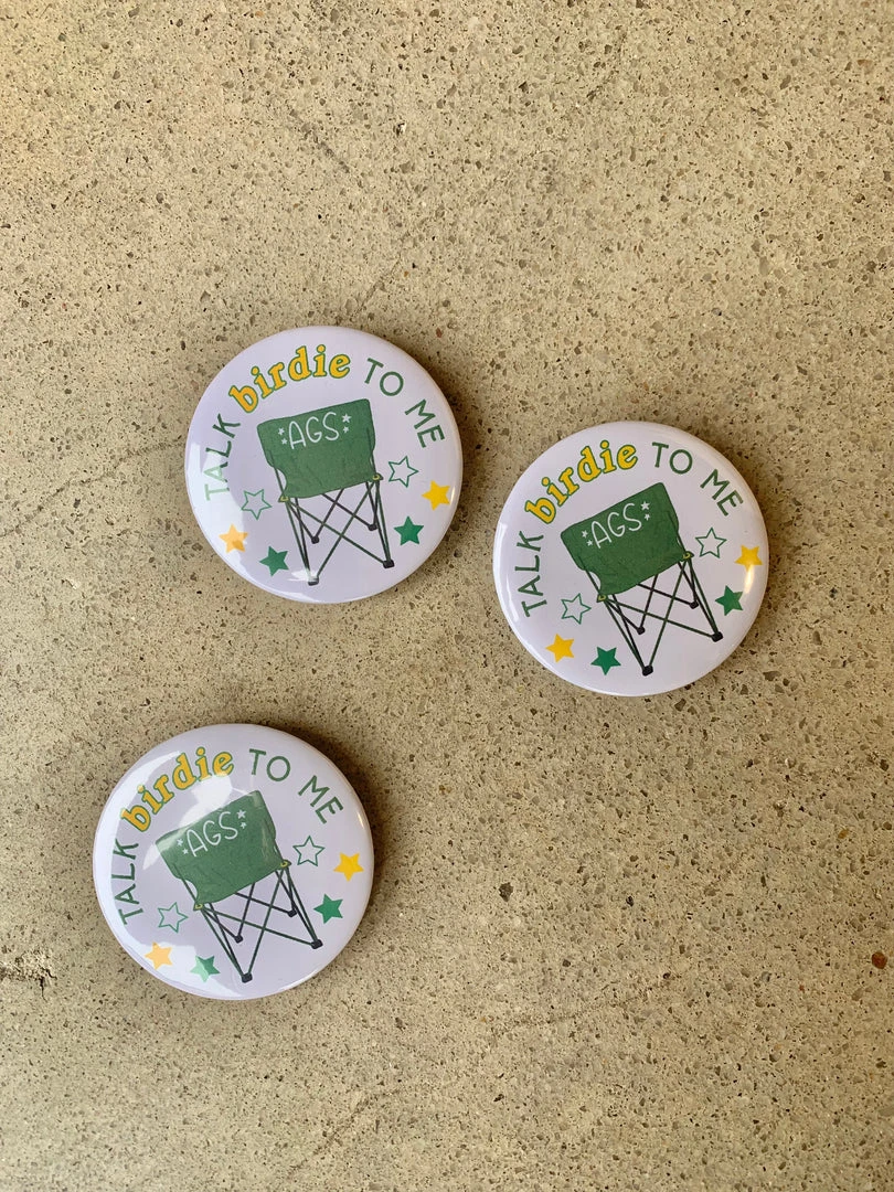 Looking for the perfect accessory to tee-off your outfit? The Talk Birdie To Me Button is for you! It comes with a secure pin that allows you to place it anywhere on your outfit, and a flat back for the perfect lay.Â