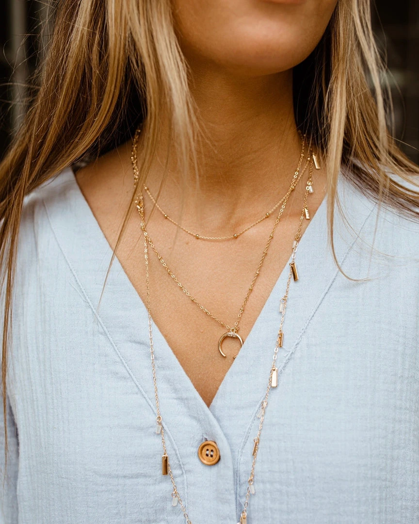 - Elevate your style with the TRENDY Wholesale Jewelry Layered Horn Pendant Necklace. This chic boho-inspired necklace features a unique horn pendant and layered design, making it a versatile accessory for any occasion.
