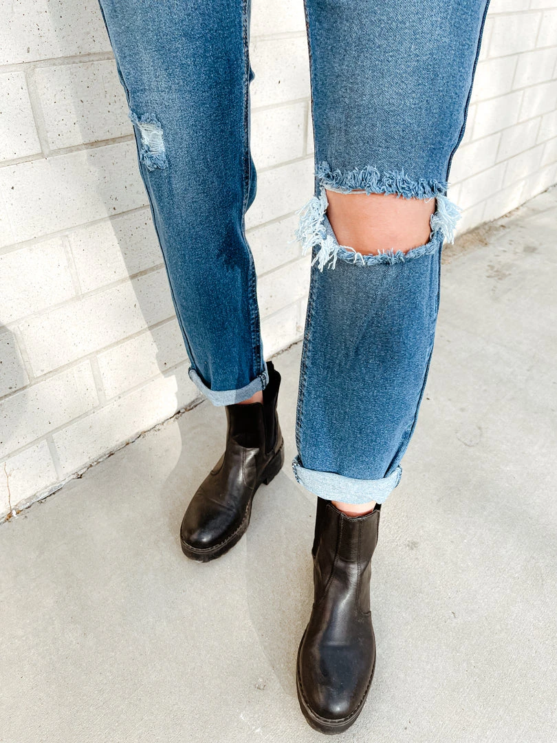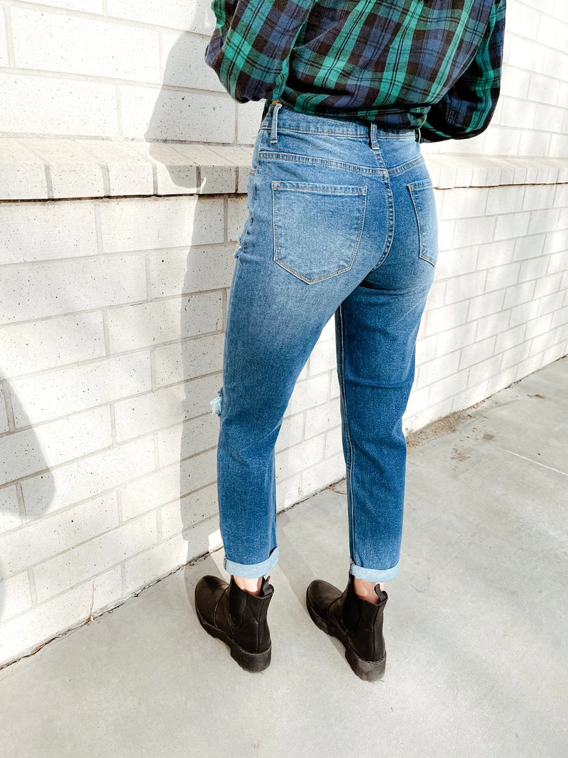 - Crafted from premium denim, the Jackie Distressed Mom Jeans are durable and designed to last. The high-waisted design provides a flattering fit, accentuating your curves.