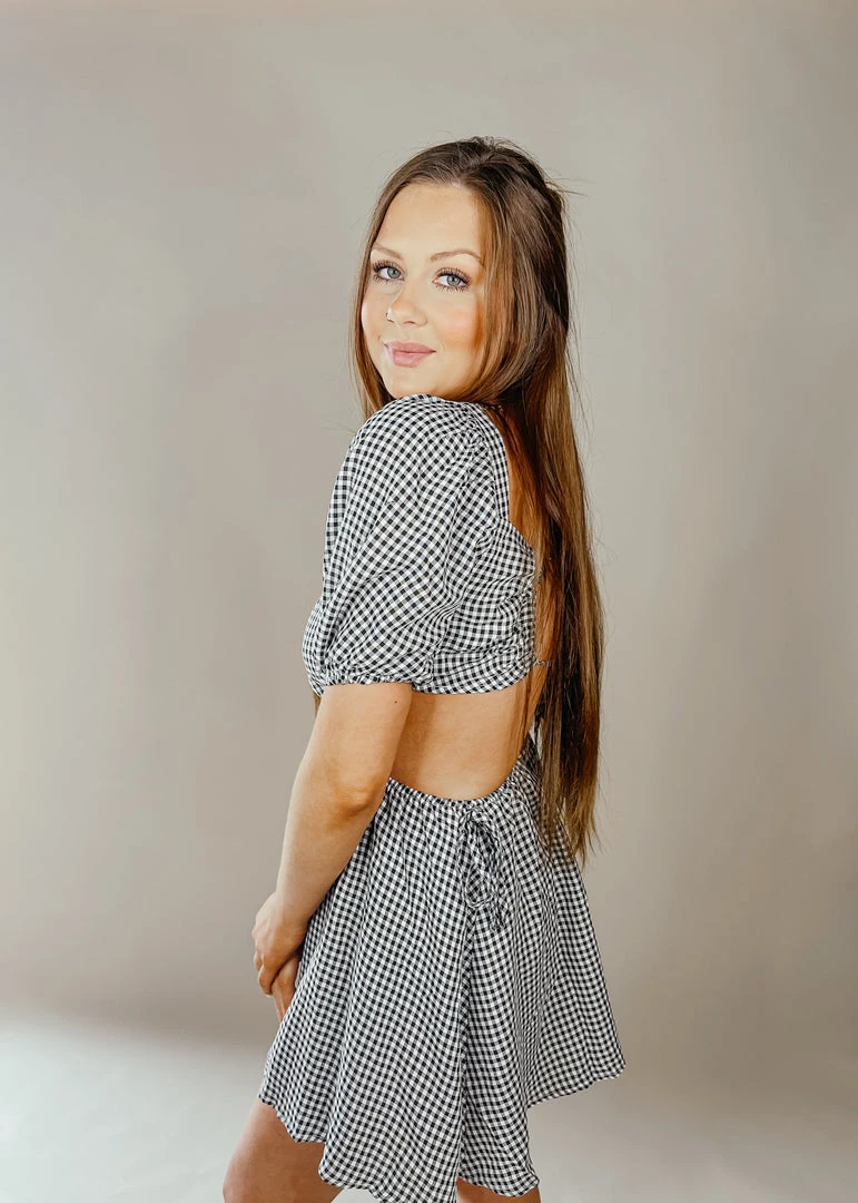 We are obsessed with gingham this season! The Maddie dress features a classic gingham pattern, a square neckline, short puff sleeves, trendy cut out accents at the side, an open back with adjustable self tie closure, and an always flattering babydoll silhouette.Â