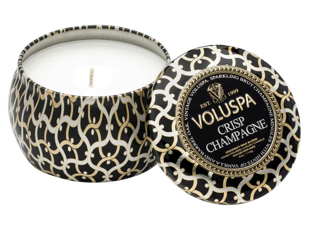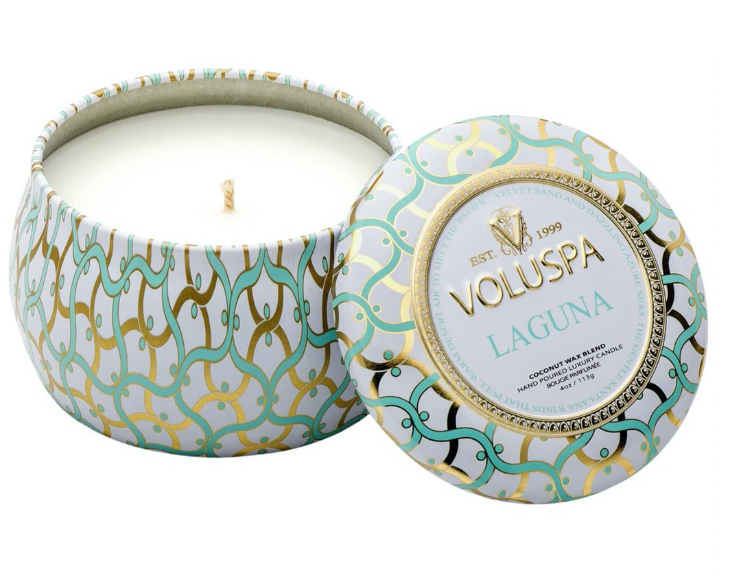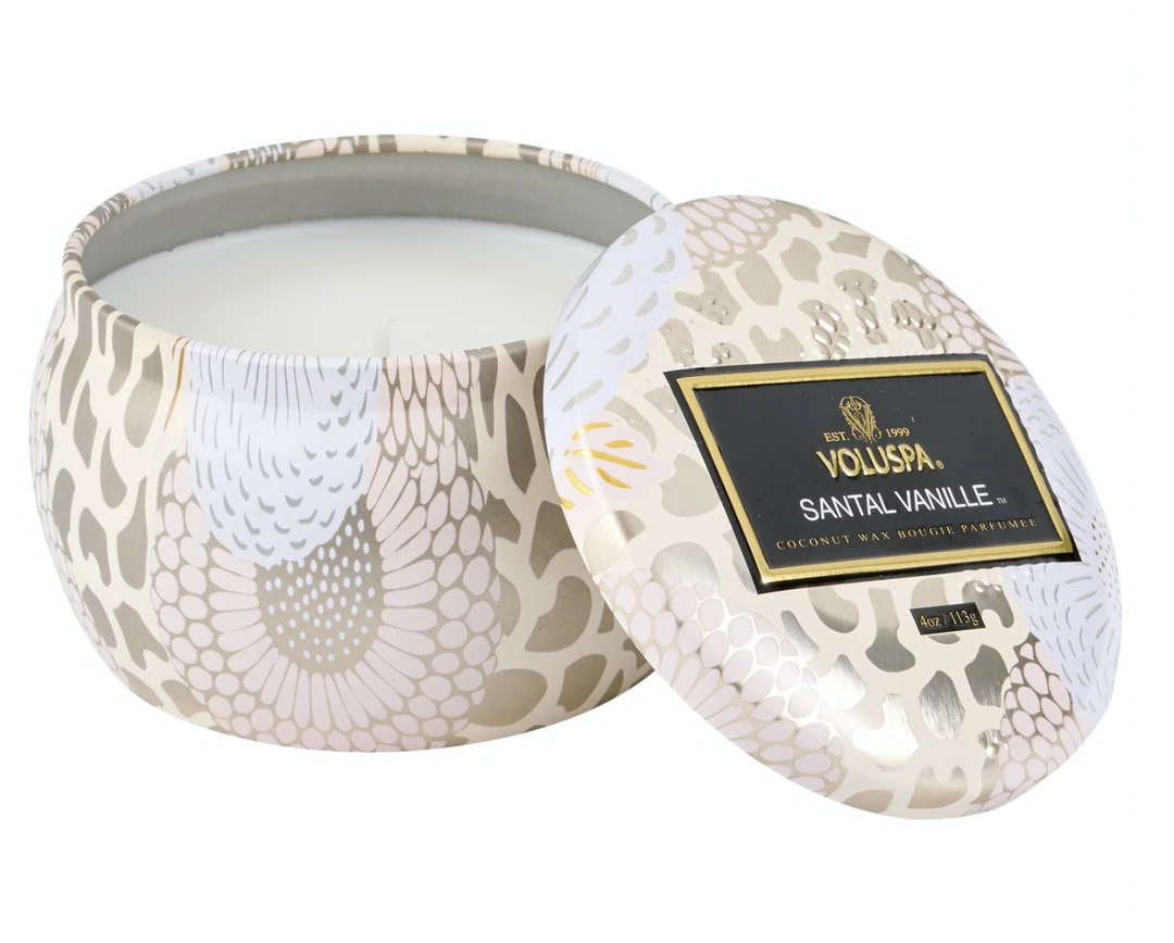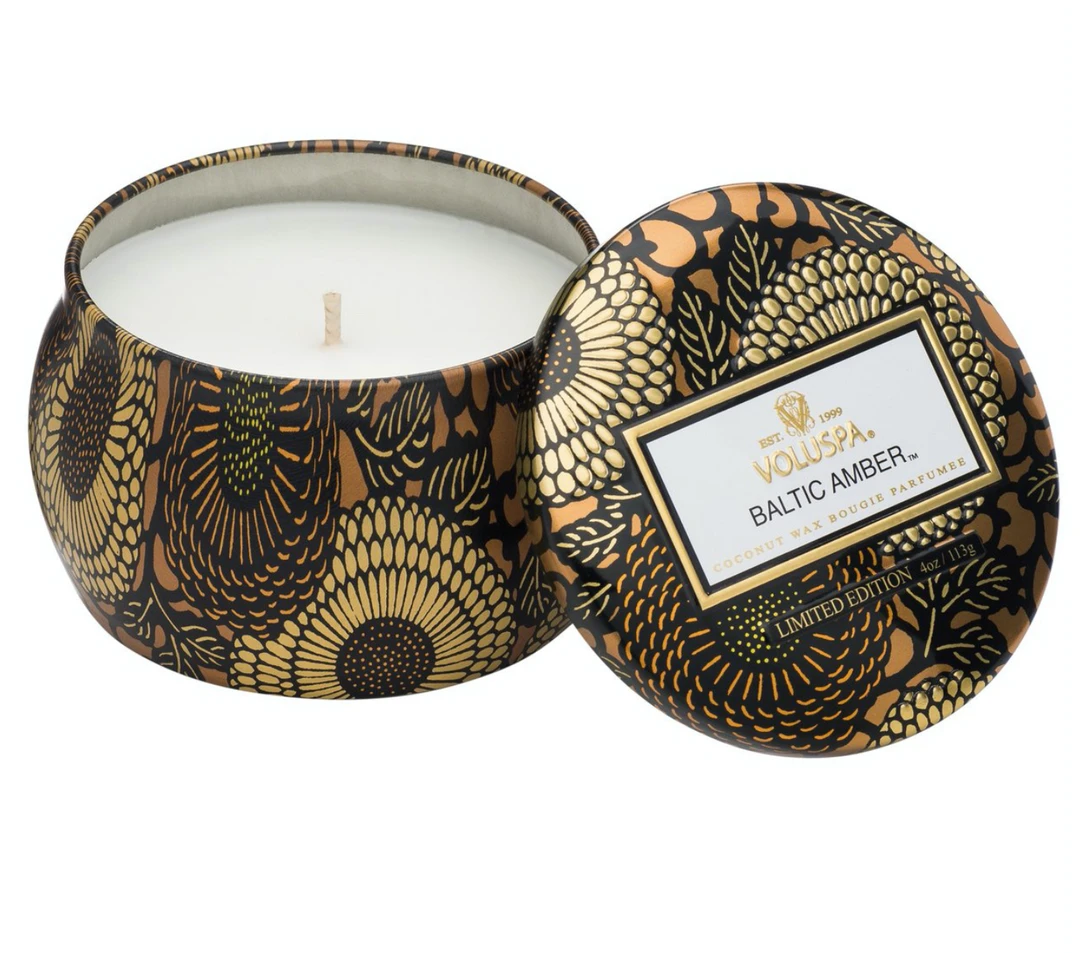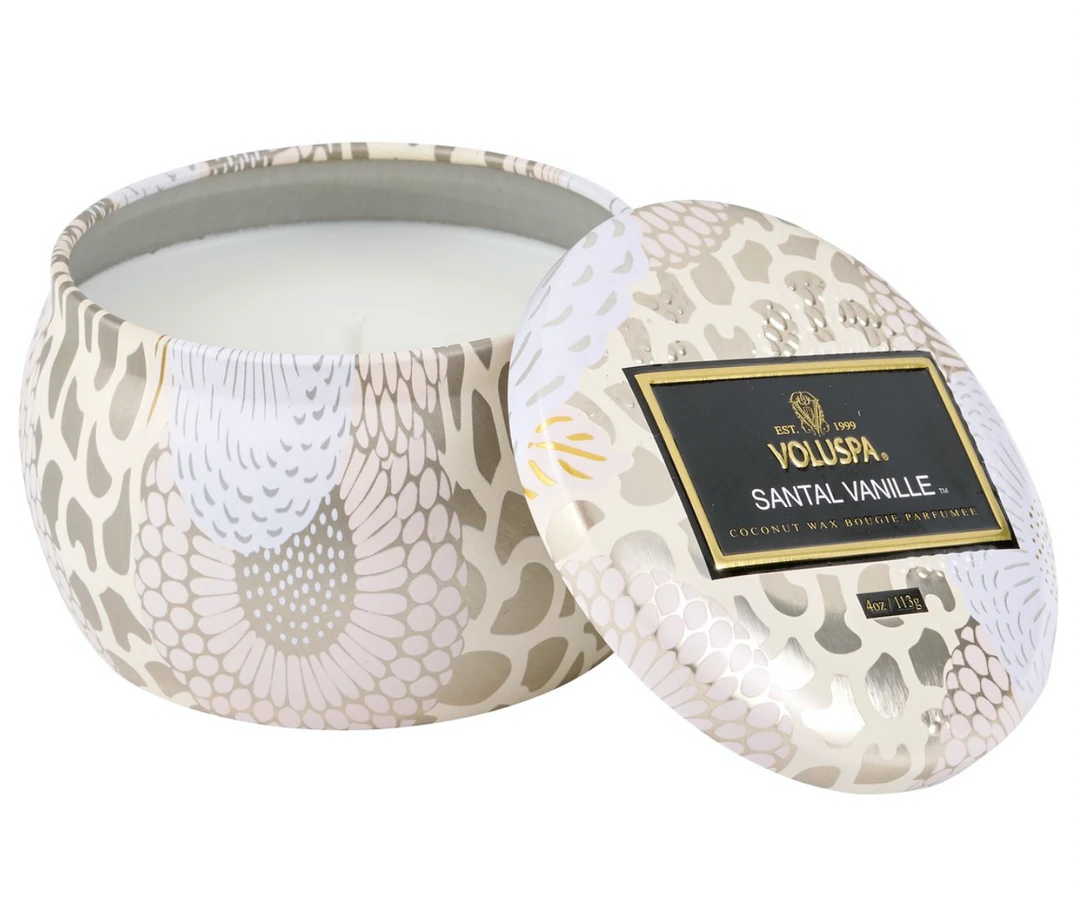 - Available in a variety of captivating fragrances, the Voluspa Petite Tin Candle offers a luxurious scent experience. Each candle is housed in a stylish, reusable tin, making it a beautiful addition to any room.