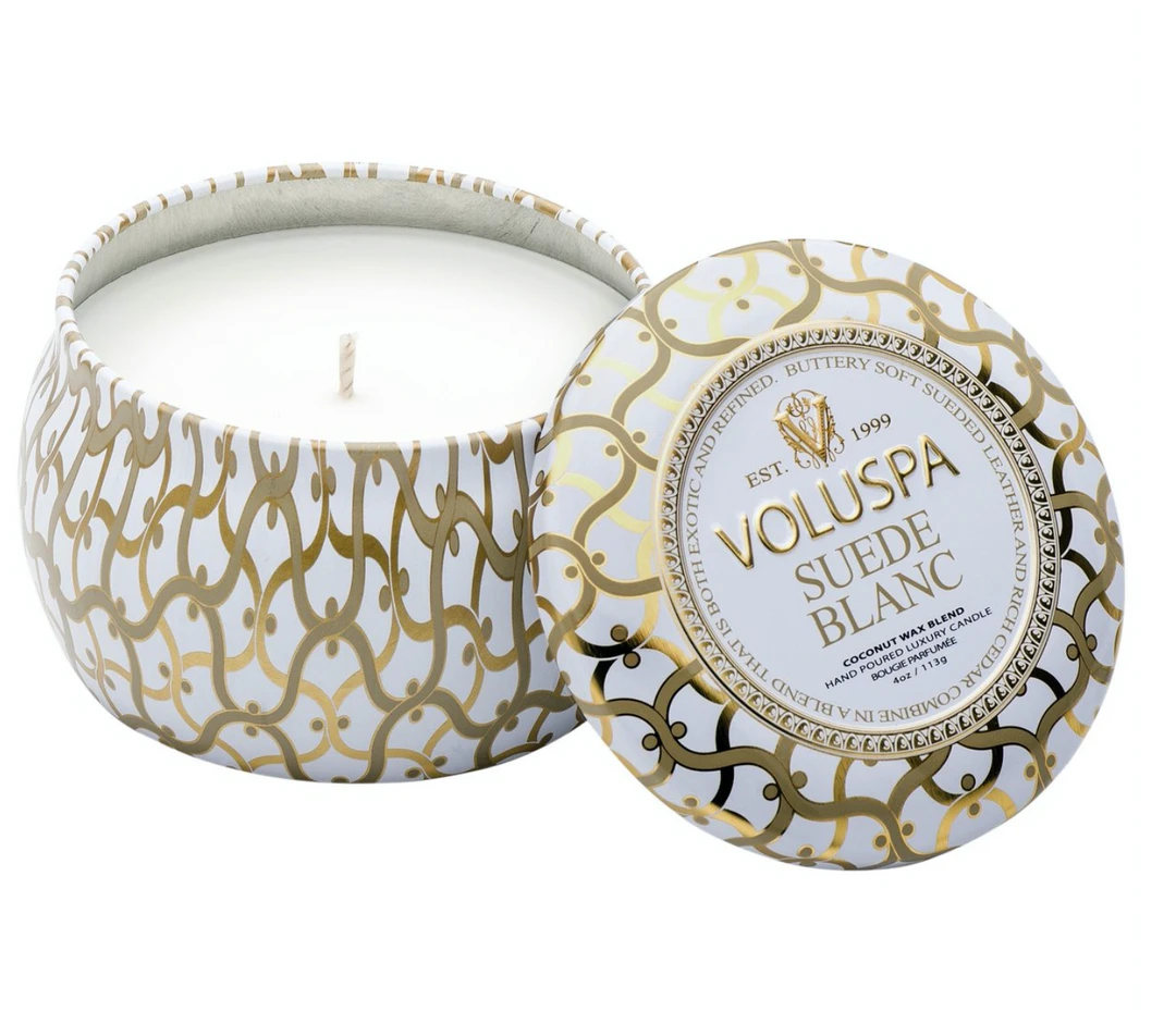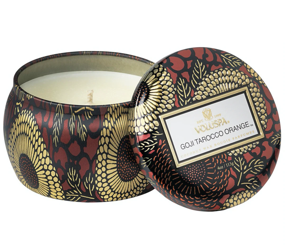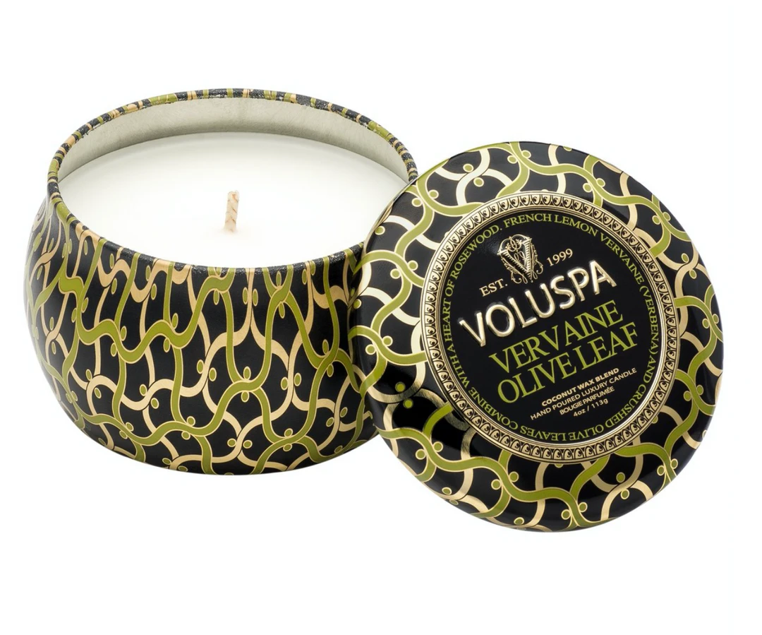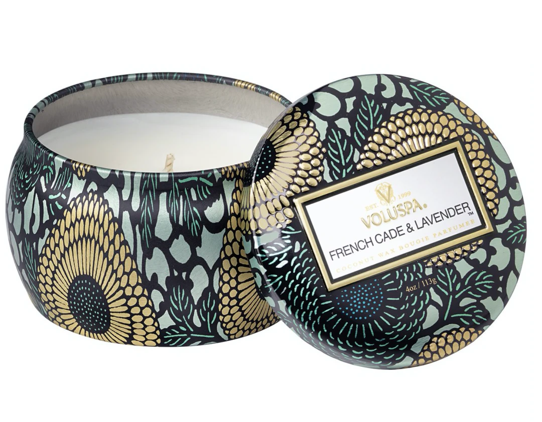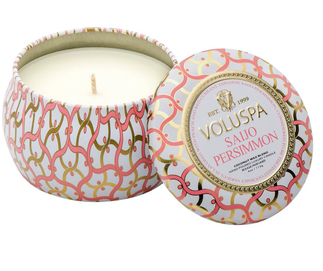 - Available in a variety of captivating fragrances, the Voluspa Petite Tin Candle offers a luxurious scent experience. Each candle is housed in a stylish, reusable tin, making it a beautiful addition to any room.