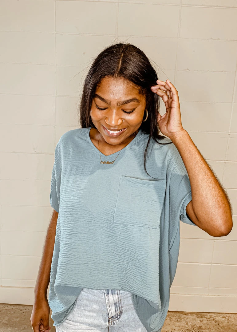 The Allison top is so versatile – you can easily dress it up or dress it down! This closet essential features a v neckline, short dolman sleeves, a pocket accent on the front, and a relaxed, flowy fit.Â