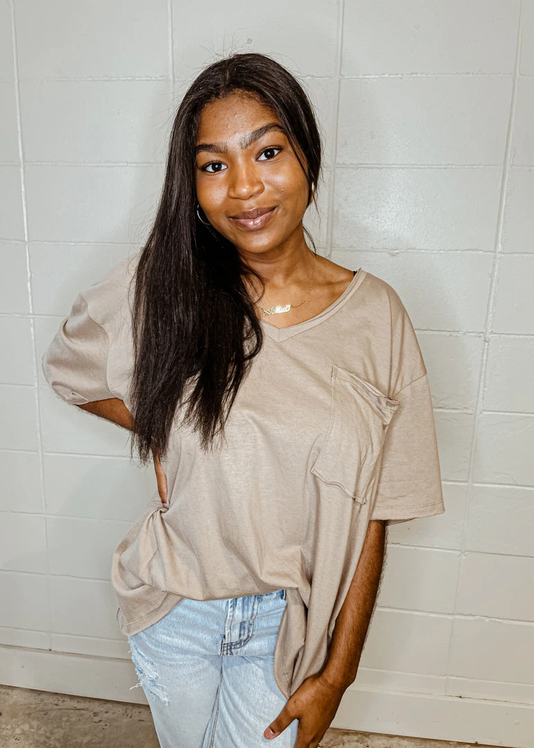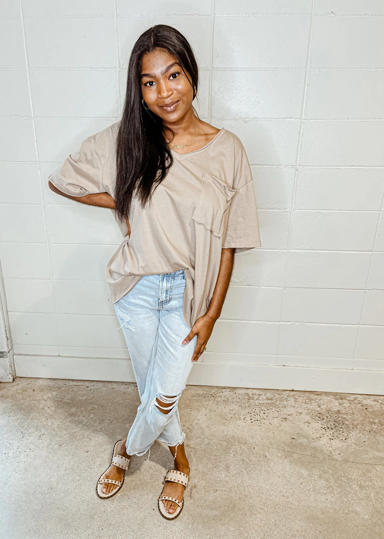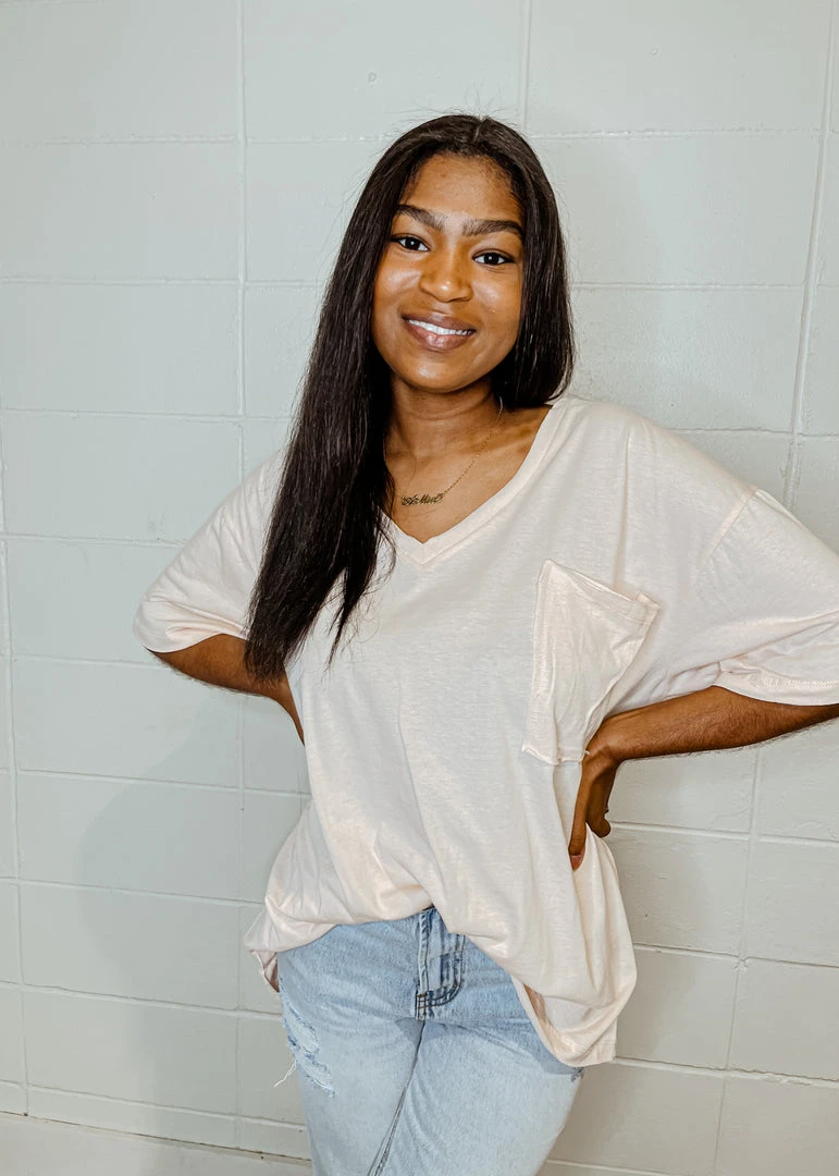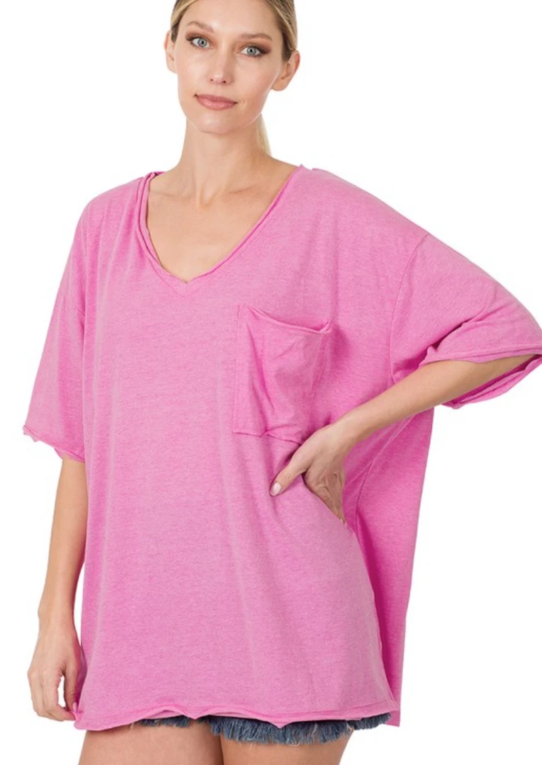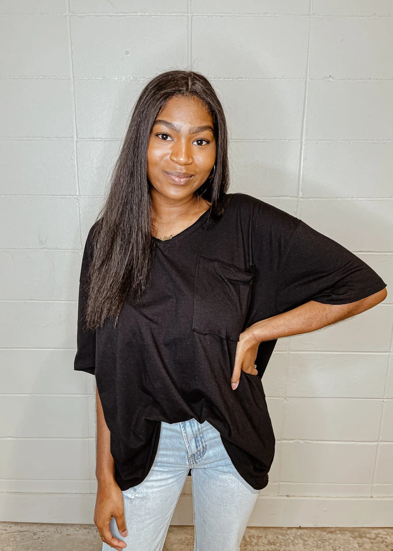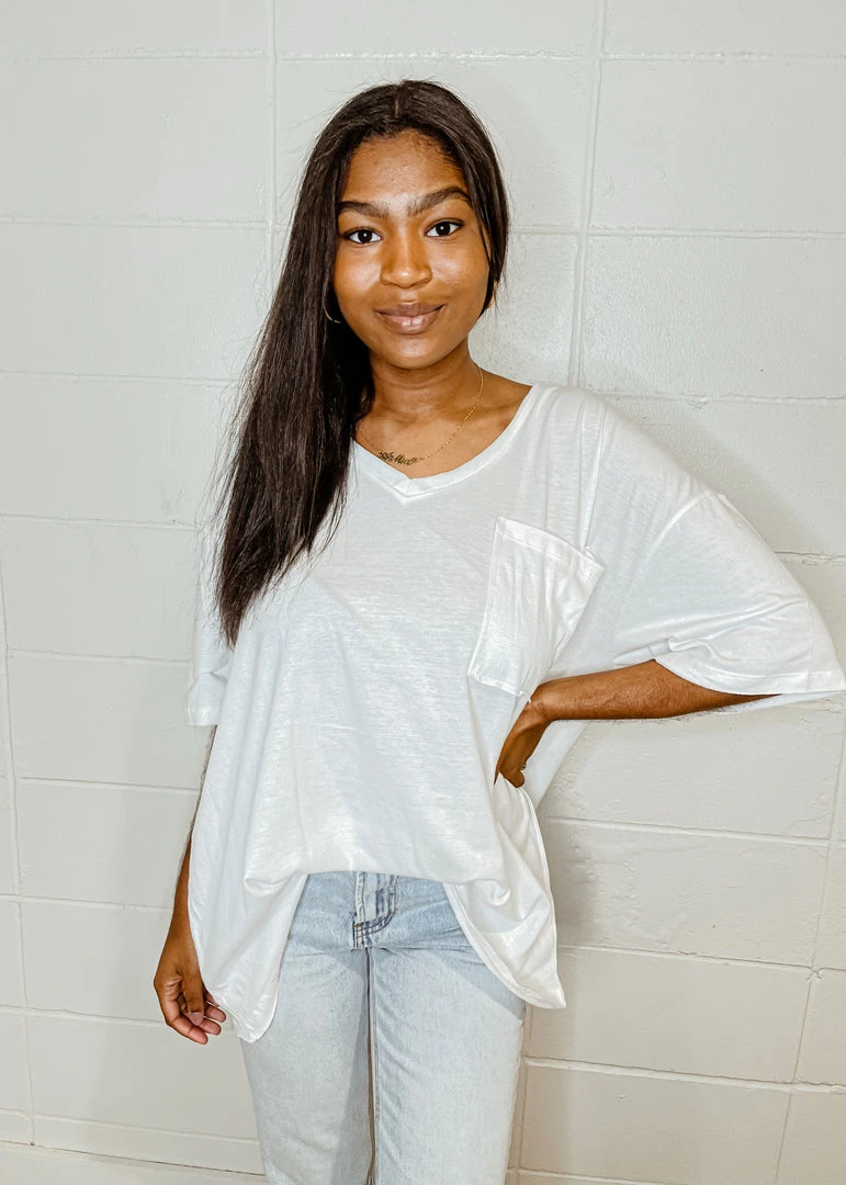 The Blake tee shirt is a core wardrobe essential! This must have tee shirt features an oversized silhouette, a pocket accent on the front, v neckline, and a raw edge hem. Easily dress the Blake tee shirt down by pairing it with your favorite loungewear or athleisure. Pair this tee shirt with denim shorts, on trend accessories, and sandals to create a more styled look.Â