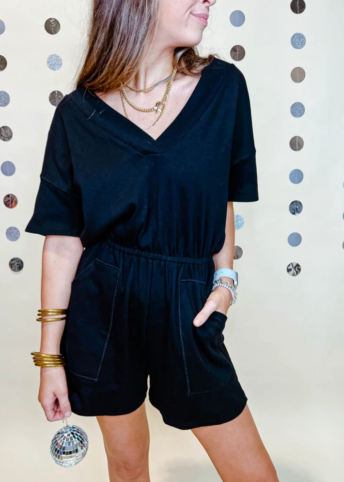 Any Romper is a must have in your wardrobe. Meet the Clear Skies V-Neck Romper. This Romper features drop shoulders, a v-neck neckline, and pockets on both sides. We love Rompers for lounging around the house, running errands, or even dressing up with your favorite hoop earrings and heels! Available in Black and Bright Pink.Â